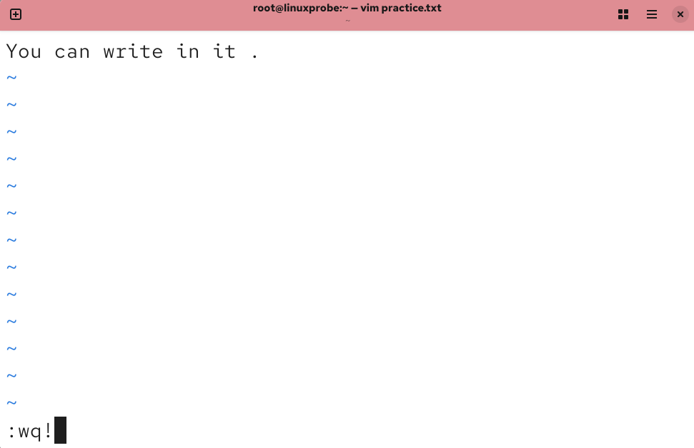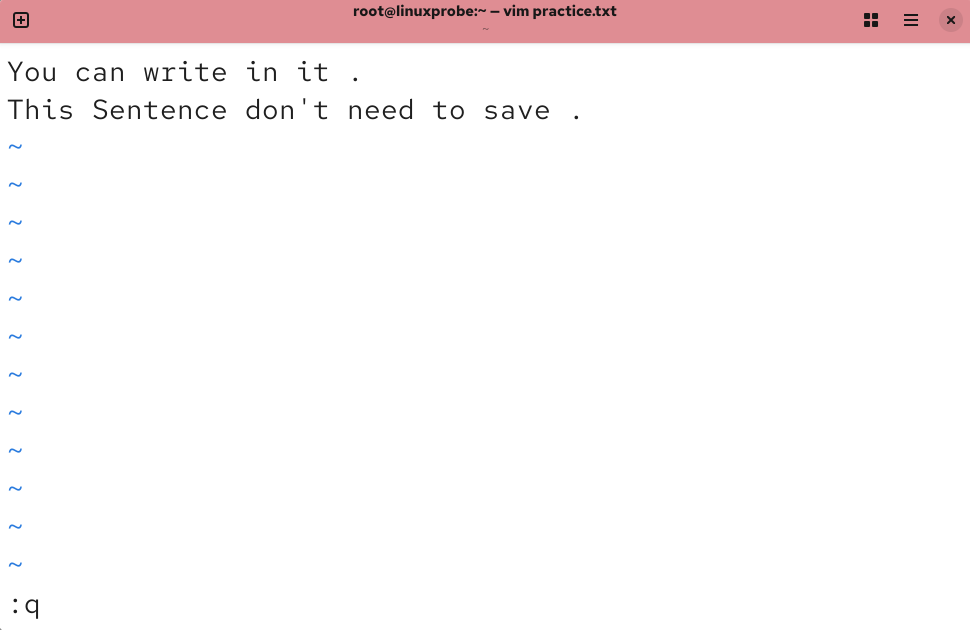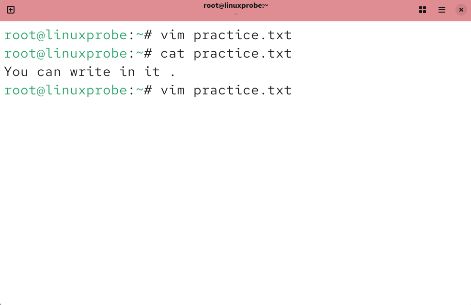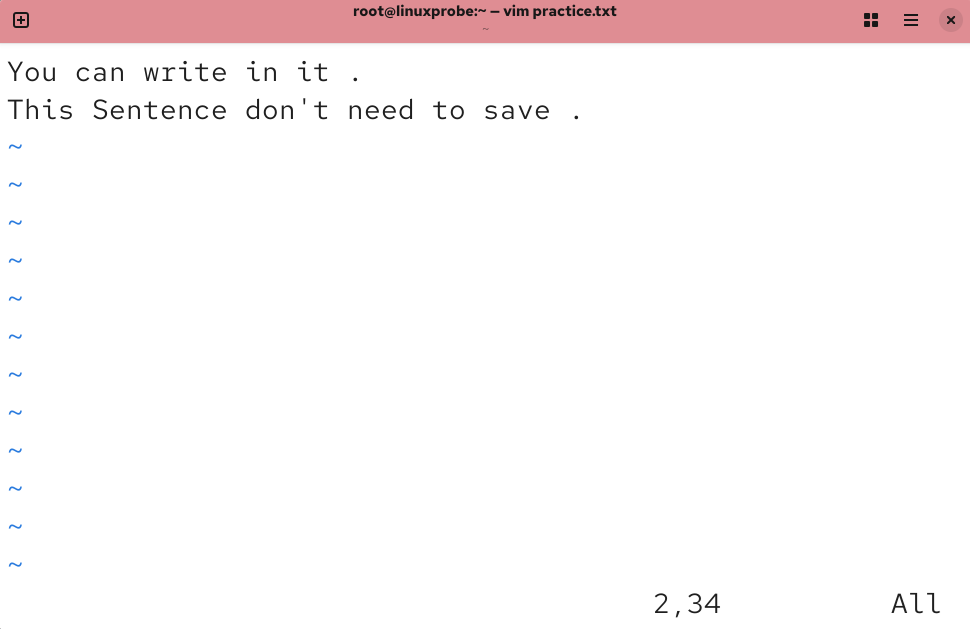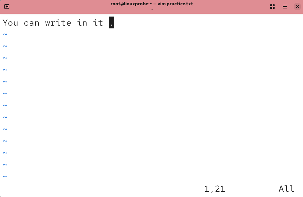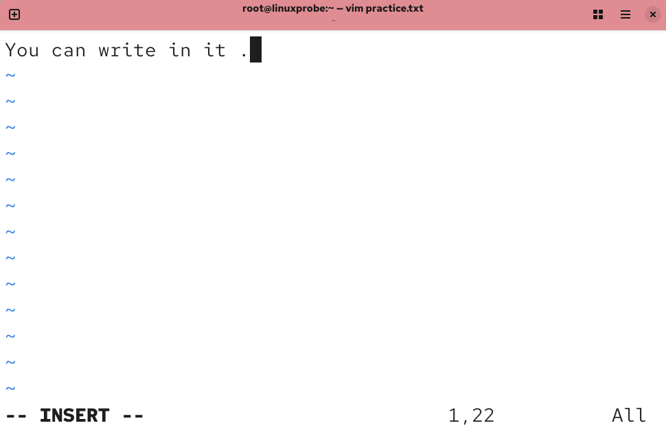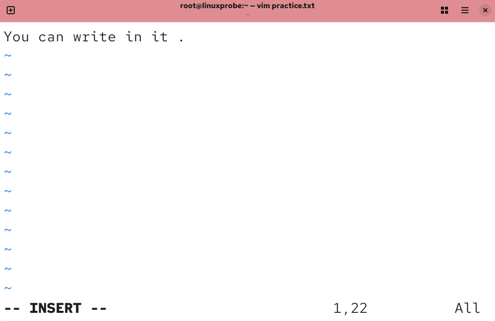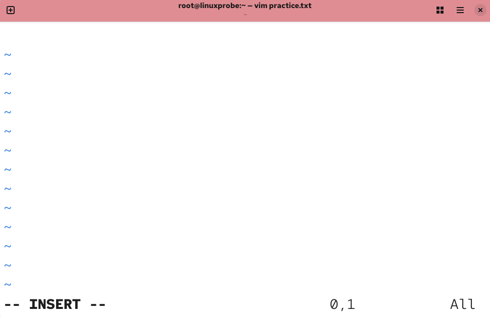 打开 practice.txt 文档后,默认进入的是 Vim 编辑器的命令模式。此时只能执行命令模式下的命令,而不能随意输入文本内容,我们需要切换到输入模式才能编写文档。
