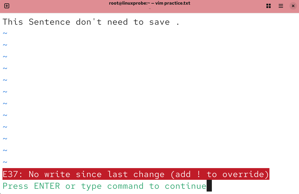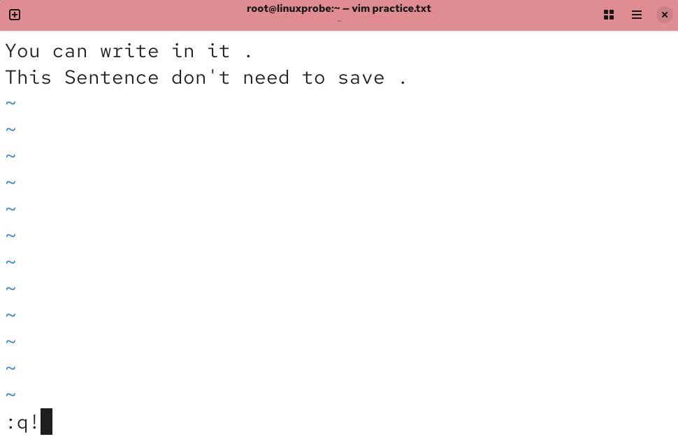 因为此时已经修改了文本内容,所以 Vim 编辑器在尝试直接退出文档而不保存的时候就会拒绝我们的操作了。此时只有强制退出才能结束本次输入操作,如图 4-13 到图 4-15 所示。