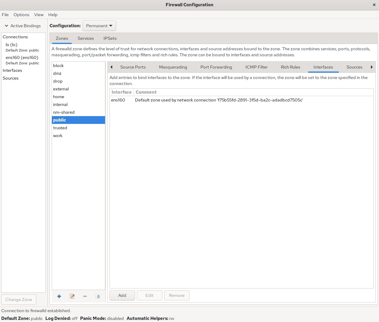 | public | 拒绝流入的流量,除非与流出的流量相关;如果流量与 ssh、dhcpv6-client 服务 相关,则允许流量 |