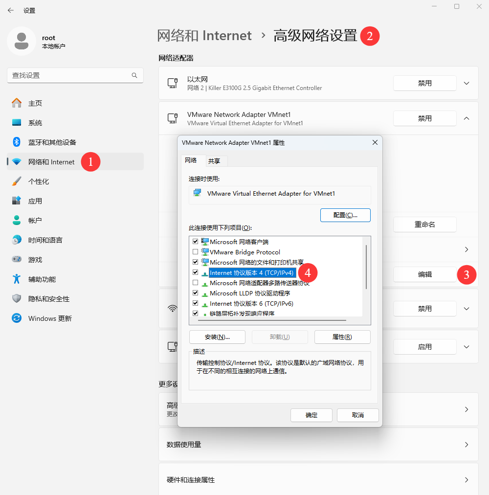 随后,我们打开本地物理机的“网络和 Internet”→“高级网络设置”界面,找到 VMnet1 网卡,单击“编辑”按钮。配置一个与虚拟机系统相同的 IP 网段的地址,步骤如图 8-16 和图8-17 所示,这样物理机和虚拟机系统的网络就能通信啦: