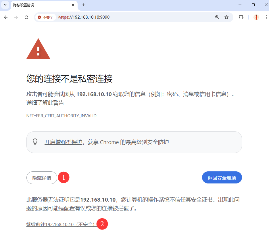 打开物理机的浏览器,在地址栏中输入“虚拟机 IP 地址:9090”即可访问 Cockpit。由于访问 Cockpit 的流量会使用 HTTPS 进行加密,而证书又是在本地签发的,因此需要信任证书后才能继续访问,如图 8-18 所示。