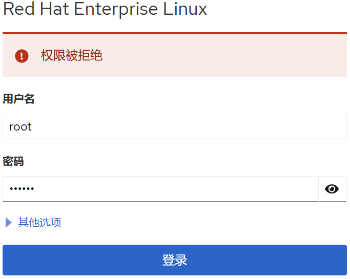 如图 8-20 所示,如果出现了“权限被拒绝”的情况千万别着急,因为 RHEL 10 系统为了安全起见,默认不允许 root 用户进行远程登录,还记得第 1 章中手动允许 root 管理员使用SSH 协议吗(见图 1-40)?此处也需要手动放行一下才能访问,删除下面文件中 root 用户的名称: