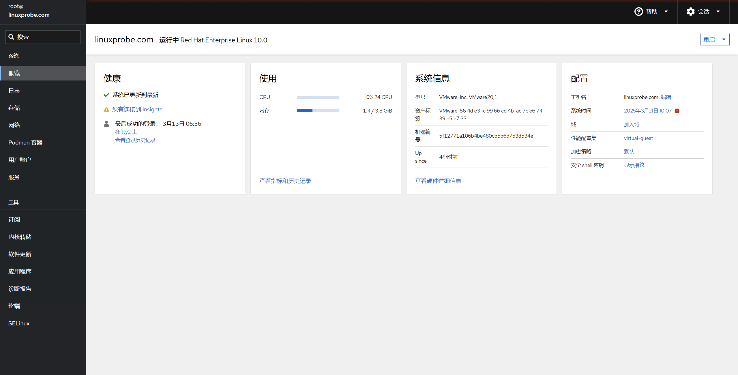进入Cockpit 的 Web 界面,发现里面可谓“别有洞天”。Cockpit 总共分为 14 个功能模块: 概览、日志、存储、网络、Podman 容器、用户账户、服务、订阅、内核转储、软件更新、应用程序、诊断报告、终端、SELinux。下面逐一进行讲解。