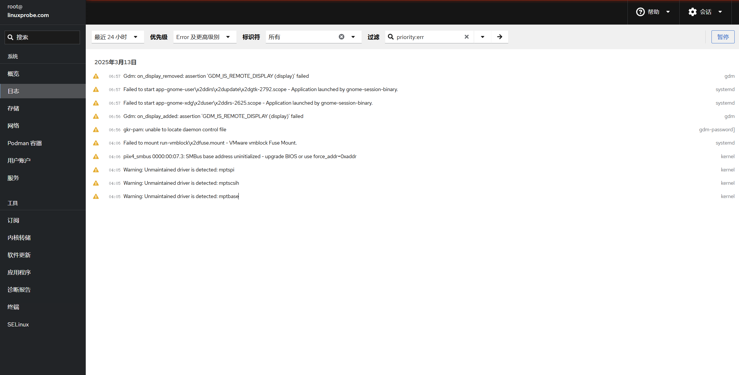这个模块能够提供系统的全部日志,但是可能有读者会好奇,为什么内容这么少呢?原因出在图 8-22 中的两个选项中:时间和优先级。通过这两个选项,用户可以更快地找到所需信息,而不是像/var/log/message 文件那样一股脑儿地都抛到屏幕上。