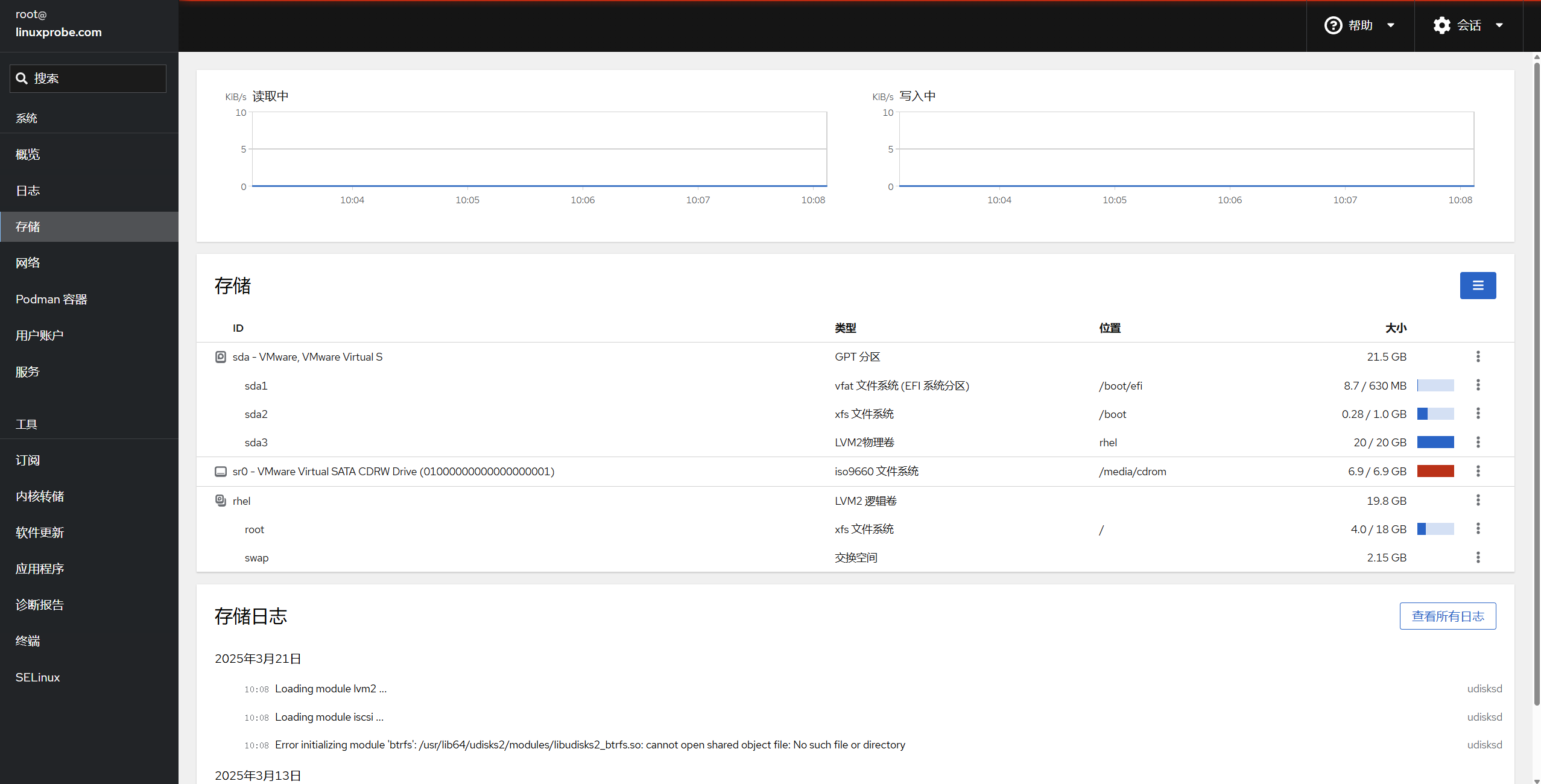 这个功能模块是同学们最喜欢的一个模块,原因不是这个模块显示了磁盘的 IO 负载情况,而是能够让用户通过该模块的界面,用鼠标创建出 RAID、LVM、VDO 和 iSCSI 等存储设备,如图 8-23 所示。是的,你没有看错,RAID 和 LVM 都可以用鼠标进行创建了,是不是很开心呢?