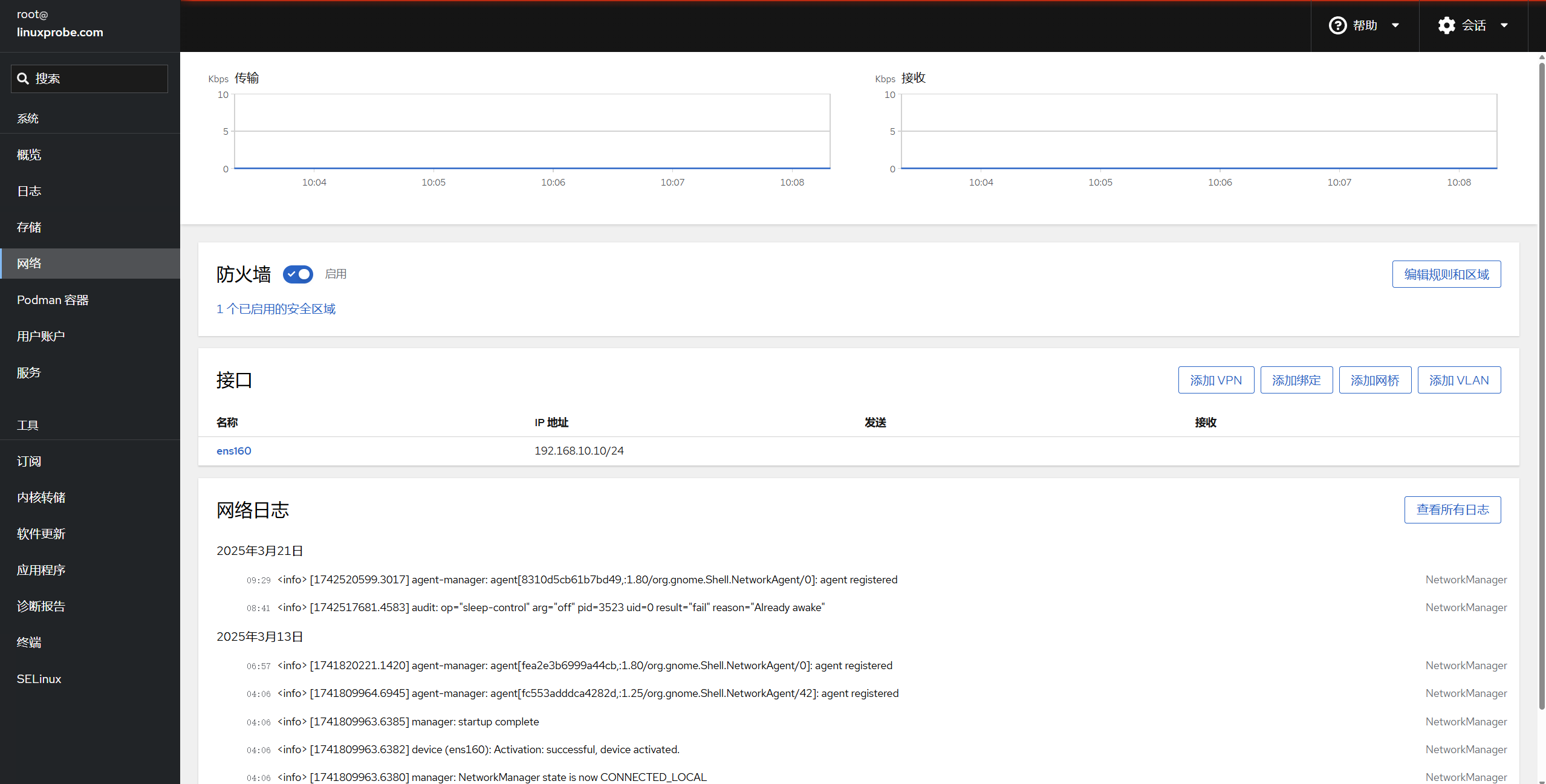 既然名为“网络”模块,那么动态查看网卡的输出和接收值肯定是这个模块的标配功能了。如图 8-24 所示,我们不仅可以在这里进行网卡的绑定(Bonding)和聚合(Team),还能够创建桥接网卡及添加 VLAN。图 8-24 的最下方会单独列出与网卡相关的日志信息。