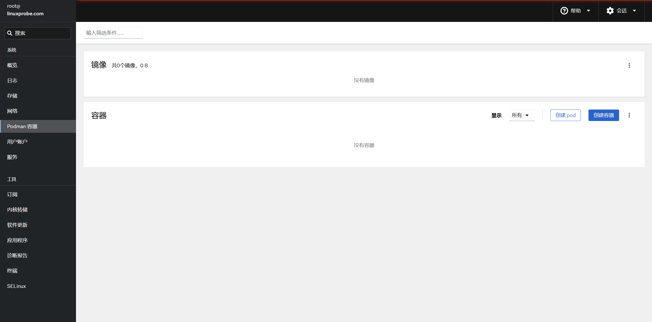 Podman 容器在 RHEL 10 系统中默认已安装,只不过还未启动,我们只需单击“启动podman”按钮即可运行服务。此外,创建和管理镜像与容器也不需要再敲命令行了,直接在图形化界面中即可操作,如图 8-25 和图 8-26 所示。