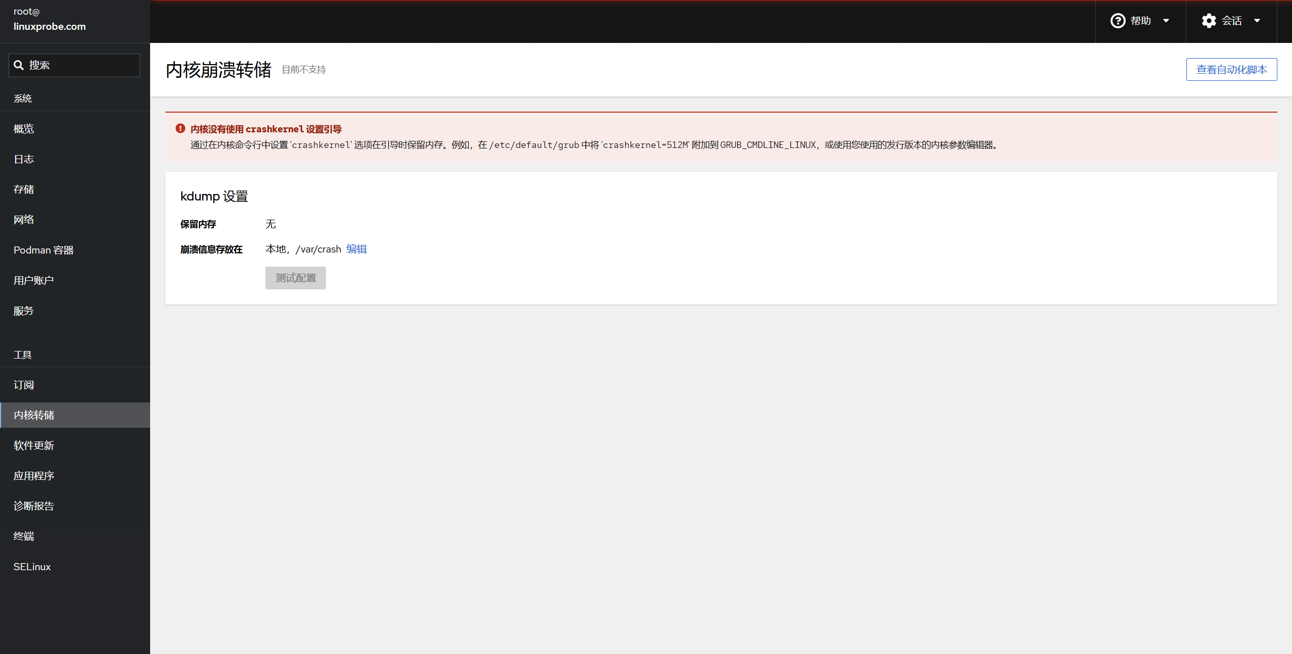 内核崩溃转储(Kernel Dump)是在系统崩溃、死锁或死机时用来收集内核参数的一个服务。举例来说,如果有一天系统崩溃了,这时 KDUMP 服务就会开始工作,将系统的运行状态和内核数据收集到一个名为 dump core 的文件中,以便后续让运维人员分析并找出问题所在。由于我们在安装系统时没有启动该服务,所以可以等到后续使用时再在该模块界面中启用该服务(见图 8-32)。