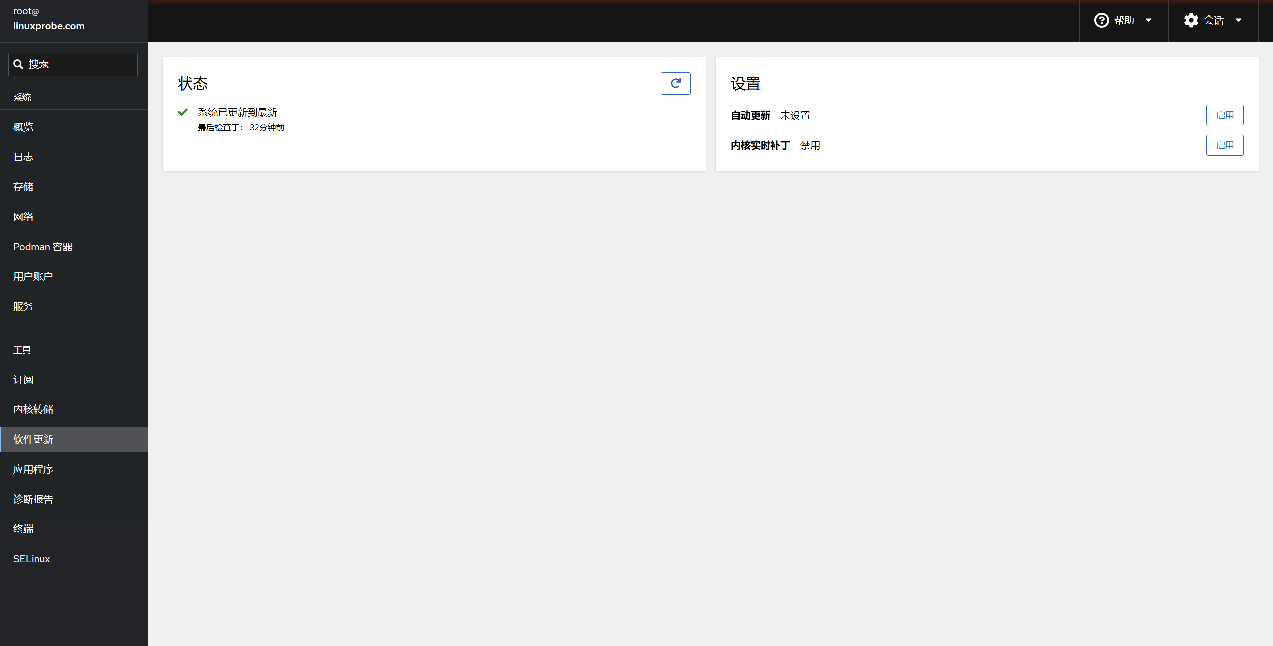 “软件更新”功能模块的界面如图 8-33 所示。但是,这里提到的“软件更新”并不是我们用来更新其他常规软件的一个界面,而是用来对红帽用户订阅的服务进行更新的界面。在购买了红帽订阅服务后,用户便可以在这里下载到相应服务程序的最新版本和稳定版本。