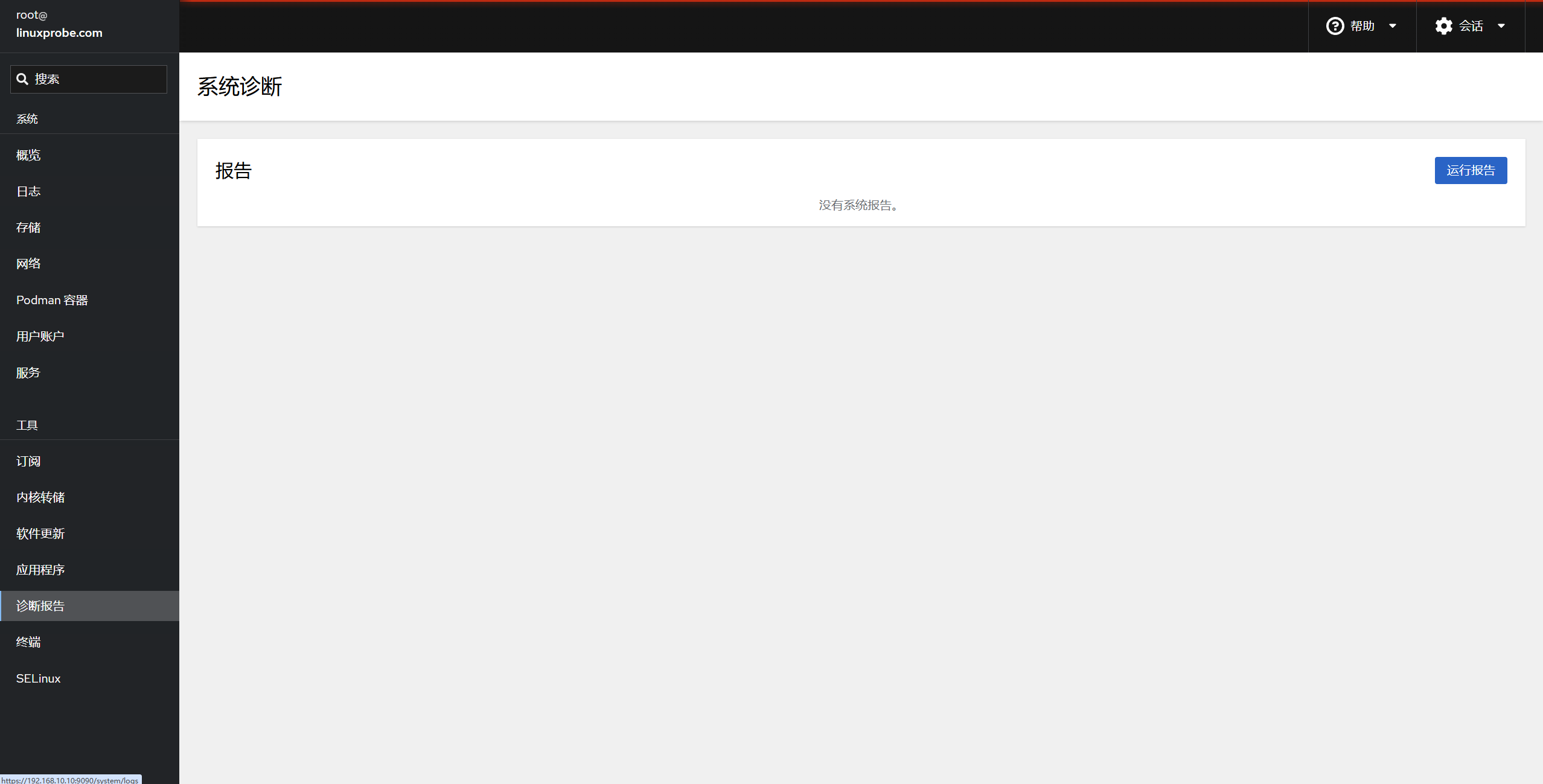 “系统诊断”模块的功能是帮助用户收集及分析系统的信息,找到系统出现问题的原因, 界面如图 8-35 所示。单击“运行报告”按钮后大约两分钟,会出现如图 8-36 所示的界面。好吧,摊牌了,这个功能其实很鸡肋,就是将 sosreport 命令做成了一个网页上的按钮。