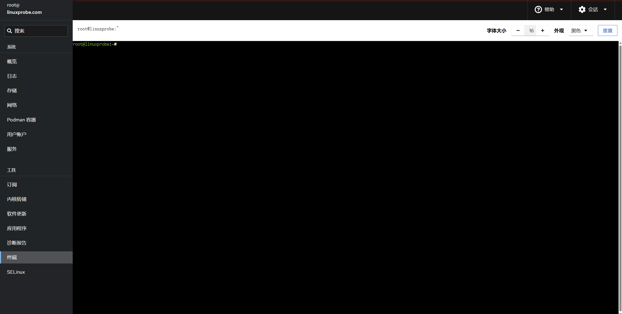 “终端”功能模块的界面如图 8-37 所示。Cockpit 服务提供了Shell 终端的在线控制平台, 可方便用户通过网页上的终端功能管理服务器。这个功能深受运维人员喜爱。