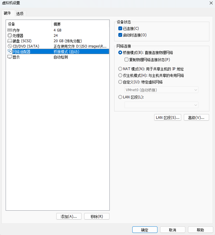 如果大家使用的是虚拟机,请把虚拟机系统的网卡(网络适配器)切换成桥接模式,如图 9-9 所示。然后重启虚拟机系统即可。
