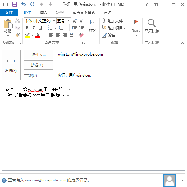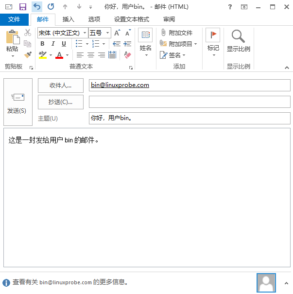 用户别名功能是一项简单实用的邮件账户伪装技术,能够用来设置多个虚拟信箱的账户以接收发送的邮件,从而保证自身的邮件地址不被泄露;还可以用来接收自己多个信箱中的邮件。刚才我们已经顺利地向 root 账户发送了邮件,下面再向 bin 账户发送一封邮件,如图 15-15 所示。