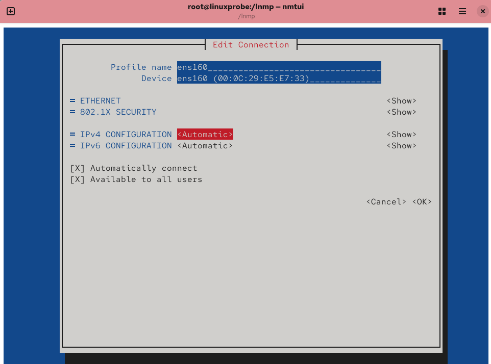 将已经调整为桥接模式的网卡,通过 nmtui 或 nm-connection-editor 命令修改为以 DHCP 模式自动获取网络信息,如图 20-2 所示。此时,大多数情况下虚拟机可以接入互联网。若依然不可访问互联网,则考虑外部环境是否有特殊的限制,然后将虚拟机内的网卡配置成与物理机的一致即可。