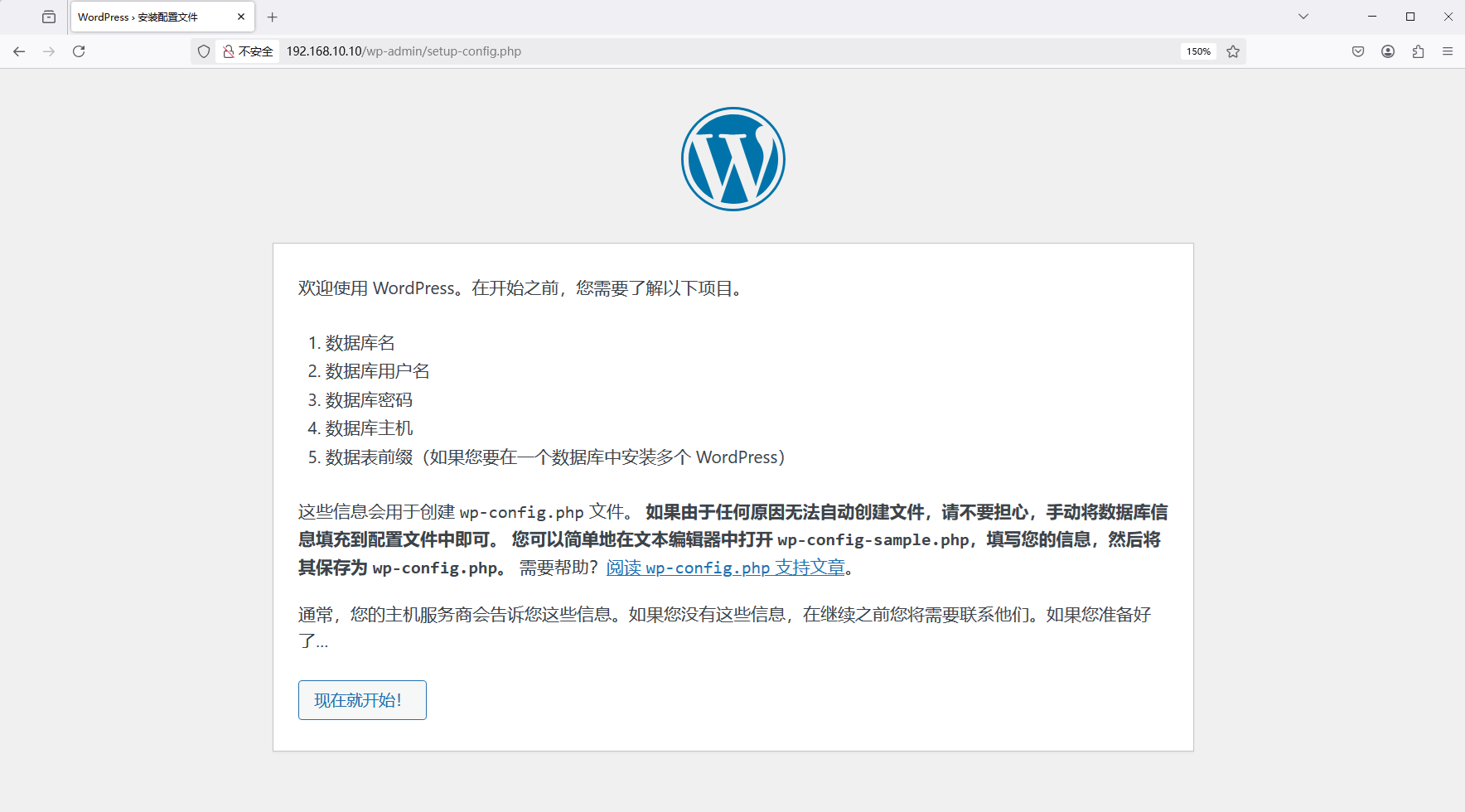 随后访问 WordPress 网站的首页面,如图 20-4 所示。该页面提醒了用户稍后需要的安装信息。